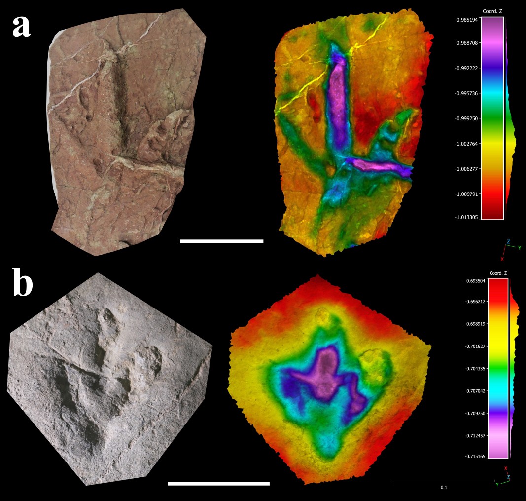Fotografía y modelo fotogramétrico de a) una icnita terópoda de tamaño medio (cf. Kayentapus isp.) y b) una icnita ornitópoda de tamaño pequeño.