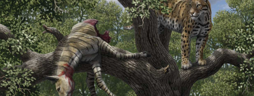 Promegantereon ogygia junto con su presa, un potro del équido Hipparion al que ha subido a un árbol para ponerlo a salvo de posibles competidores (Ilustración de Mauricio Antón).