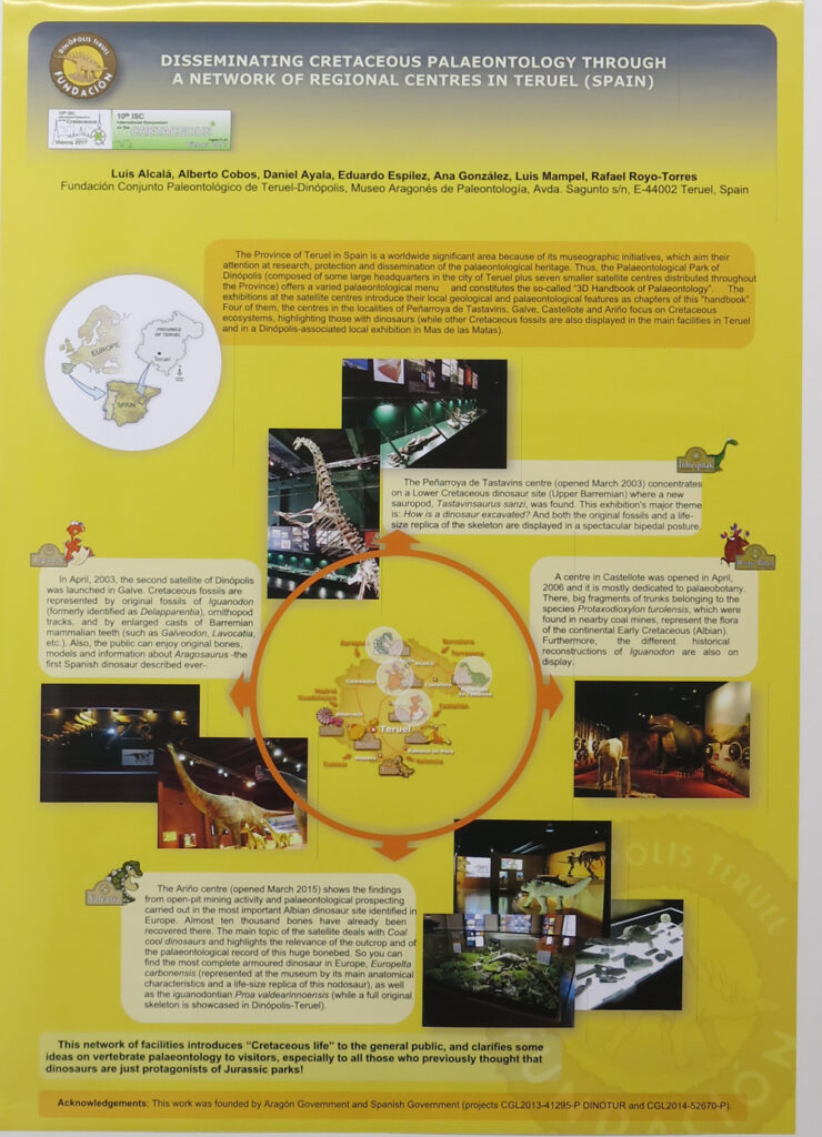 En la primera de ellas se introdujo -a los 240 expertos inscritos- el concepto de los satélites de Dinópolis, ejemplificado en los cuatro que se centran en fósiles cretácicos emblemáticos (especialmente de dinosaurios) y en sus ecosistemas; se trata de los situados en Peñarroya de Tastavins, Galve, Castellote y Ariño. Además, se mencionaron los fósiles del Cretácico que se muestran en las instalaciones centrales de Dinópolis en Teruel y en el centro asociado de Mas de las Matas. La presentación concluye que esta red de exposiciones introduce la “vida del Cretácico” al público en general y aclara algunas ideas de la paleontología de vertebrados, especialmente a quienes pudieran creer que los dinosaurios son sólo protagonistas de “parques jurásicos”.