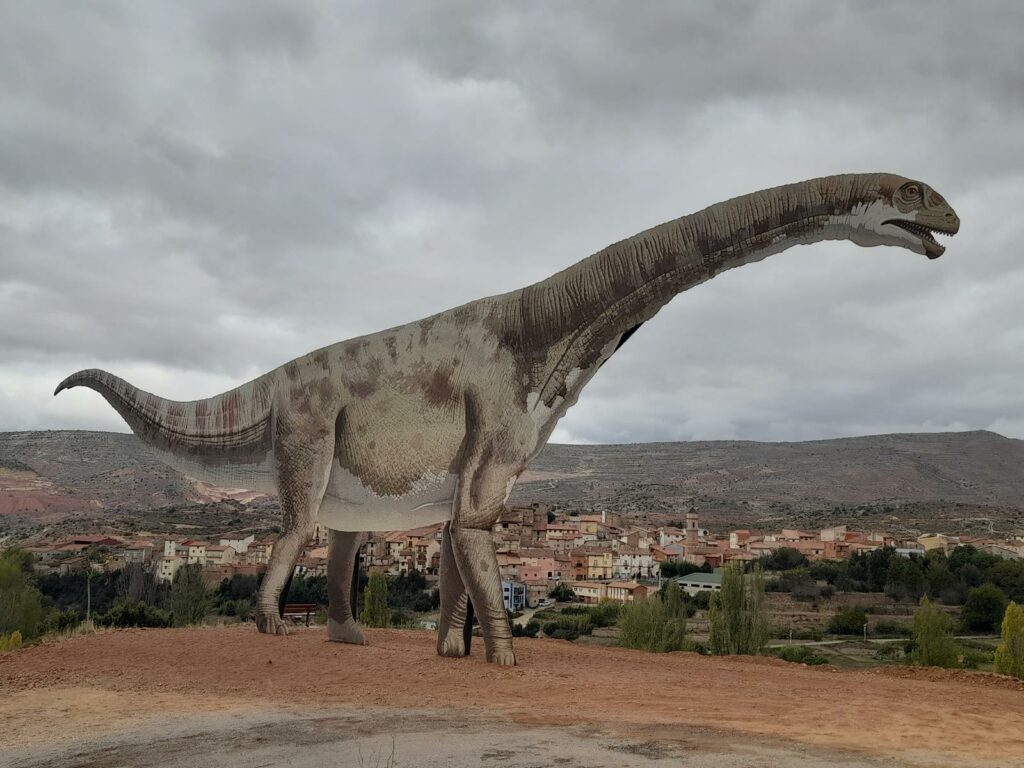 Reconstrucción de Turiasaurus riodevensis a escala real con el municipio de Riodeva al fondo