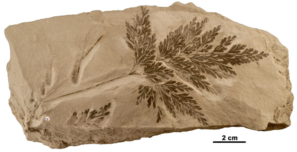 Parte de un fronde fértil (hoja con estructuras reproductoras) del helecho Ruffordia goeppertii procedente del Cretácico Inferior de Oliete (Teruel).