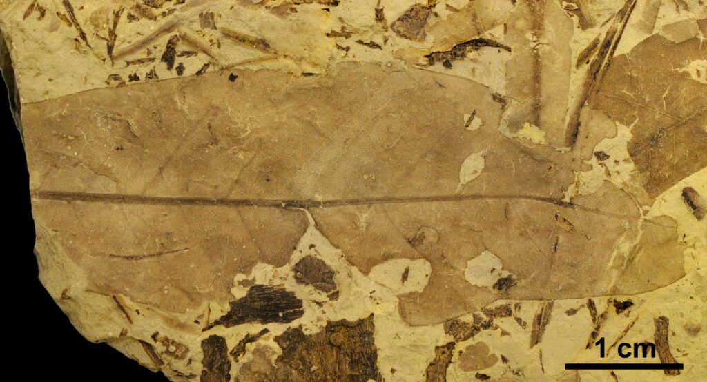 Hoja de angiosperma acuática con puesta de huevos y marcas de alimentación marginal con bordes de reacción (en color marrón), encontrada en el yacimiento de Estercuel.