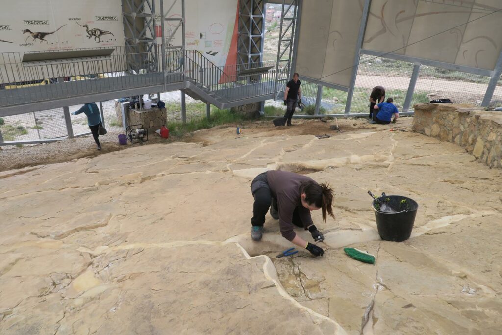 Desde hace tres años, la Fundación Conjunto Paleontológico de Teruel-Dinópolis ha venido llevando a cabo las tareas de mantenimiento, limpieza y consolidación necesarias para la adecuada conservación de las icnitas de los yacimientos de icnitas “Las Cerradicas” y “Corrales del Pelejón” en Galve. Durante este año 2023 las tareas han consistido principalmente en una limpieza general sobre la superficie de los yacimientos, la eliminación de toda la vegetación crecida en el estrato fosilífero y zonas próximas, así como el nuevo relleno de grietas y la restitución de los morteros alterados.