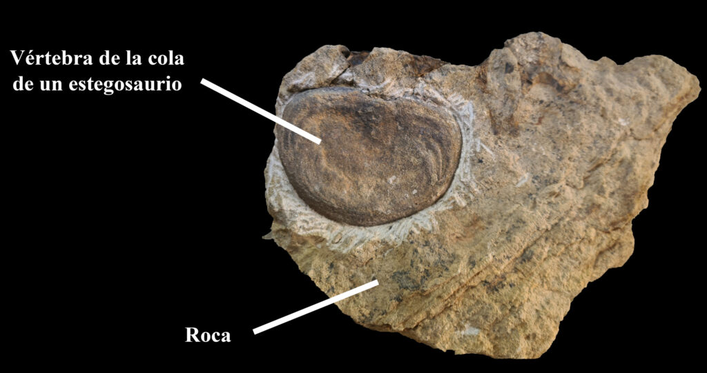 Una de las vértebras caudales de un dinosaurio estegosaurio procedente de Riodeva durante su proceso de extracción de la roca.