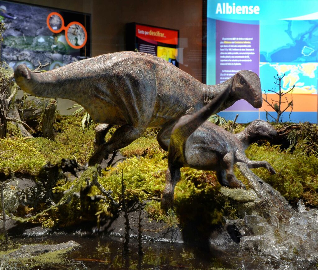 El ornitópodo Proa en el interior de la sede de Dinópolis (Valcaria) en Ariño (Teruel).