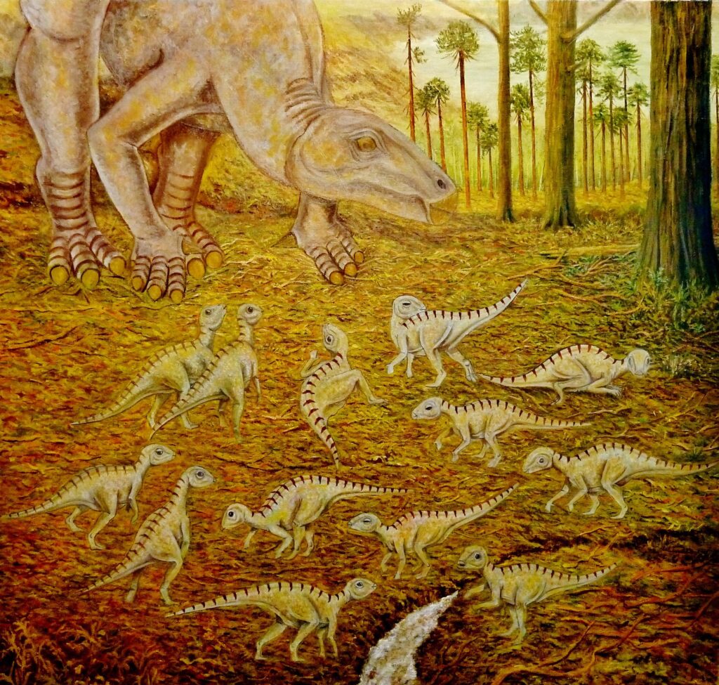 Reconstrucción de una posible guardería de Iguanodon galvensis en el entorno de Galve hace 127-129 millones de años. Créditos: Rafael Arrabal.