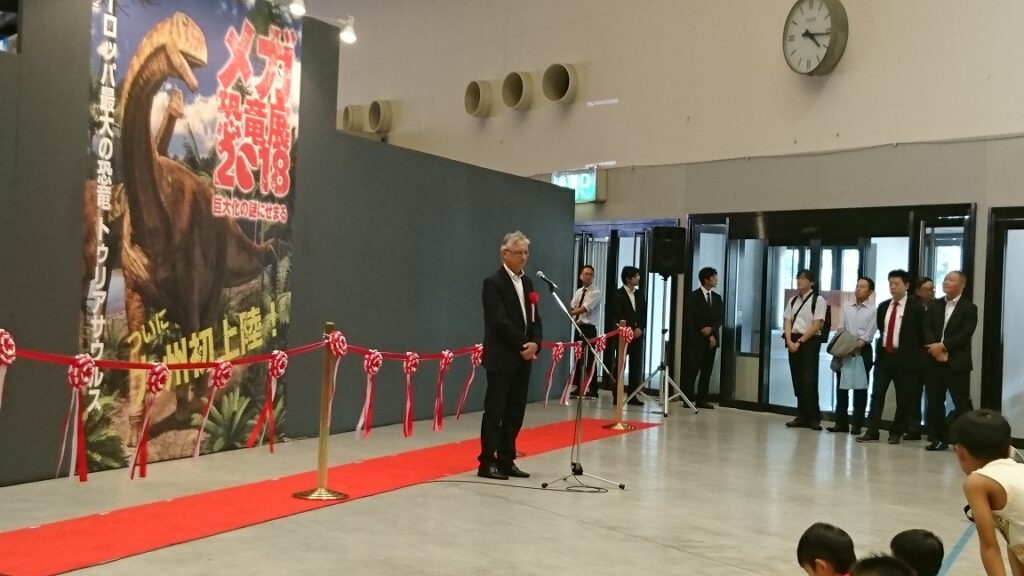 Luis Alcalá se dirige a los asistentes durante el acto inaugural de la exposición “Megadinosaurios” en Kitakyushu ante el gran cartel de Turiasaurus que preside su entrada.