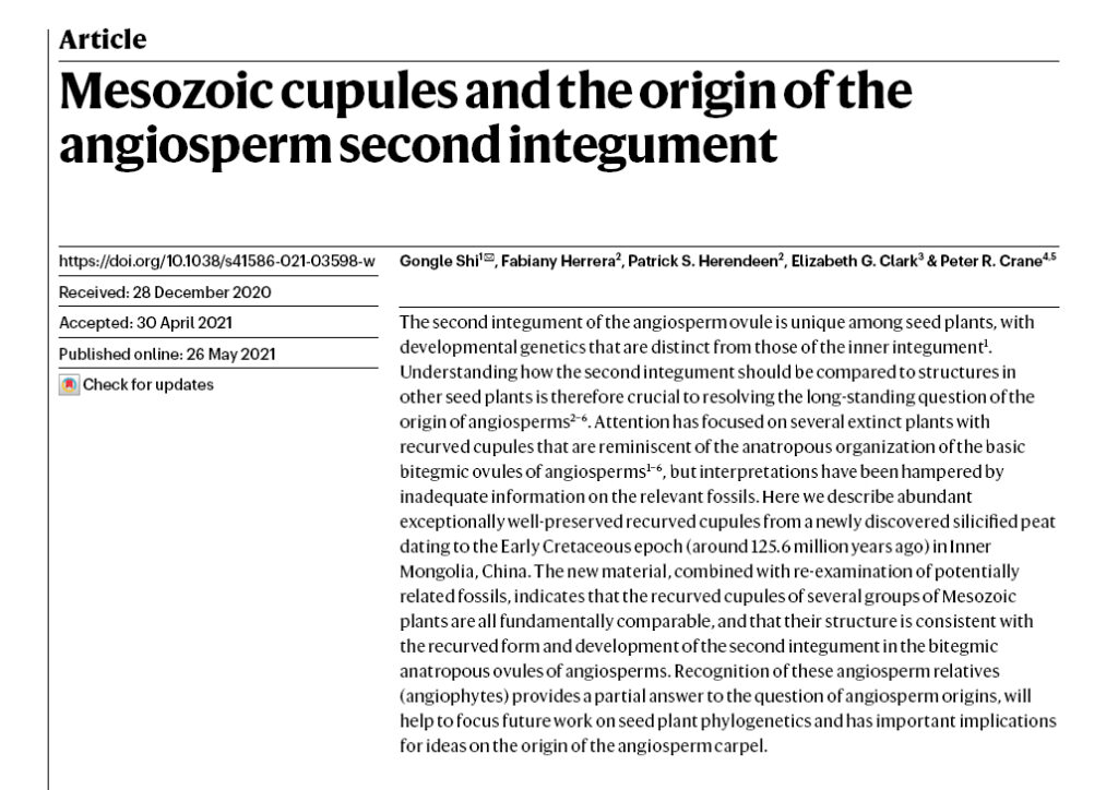 Gongle Shi, Fabiani Herrera, Patrick S. Herendeen, Elizabeth G. Clark, & Peter R. Crane (2021). Mesozoic cupules and the origin of the angiosperm second integument. Nature, 594, 223–226.