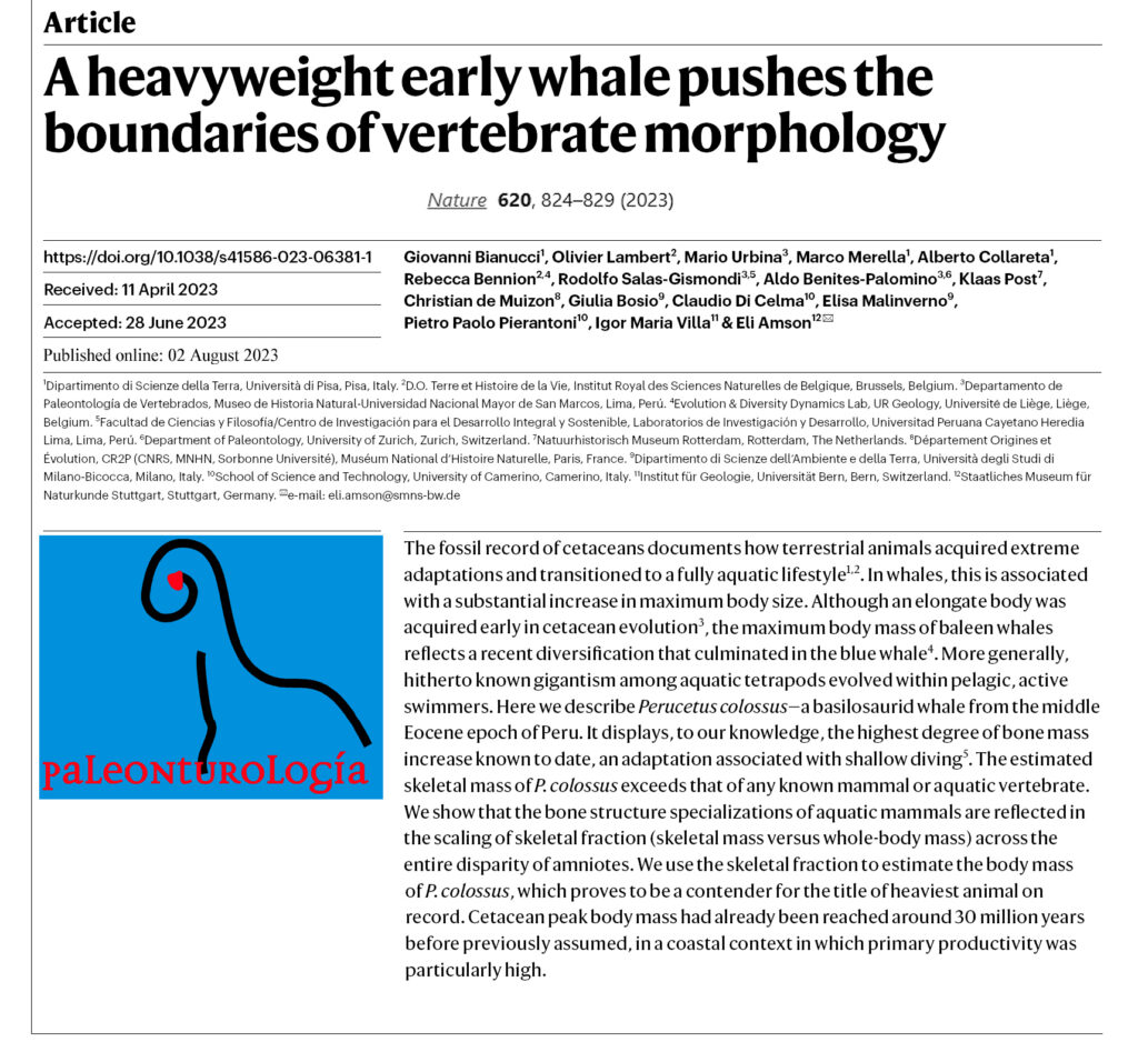 El jurado del Premio Internacional de Investigación en Paleontología ‘Paleonturología 2024’, convocado por la Fundación Conjunto Paleontológico de Teruel-Dinópolis, ha decidido por unanimidad otorgar el premio al trabajo titulado “A heavy weight early whale pushes the boundaries of vertebrate morphology”, publicado en la revista Nature por Giovanni Bianucci y colaboradores. El trabajo estudia los restos fósiles de un cetáceo gigante encontrados en depósitos marinos costeros de hace unos 37 millones de años, en lo que actualmente es el desierto del valle de Ica en el sur de Perú. El análisis de los huesos encontrados (13 inmensas vértebras, 4 largas costillas y parte de la cadera) de este gran mamífero marino, desarrollado con diversas técnicas de investigación, indicarían que esta ballena primitiva tendría una longitud de unos 18 metros y una gran masa que se estima que podría llegar a pesar más de 300 toneladas, por lo que podría tratarse del animal con mayor peso corporal conocido hasta el momento.